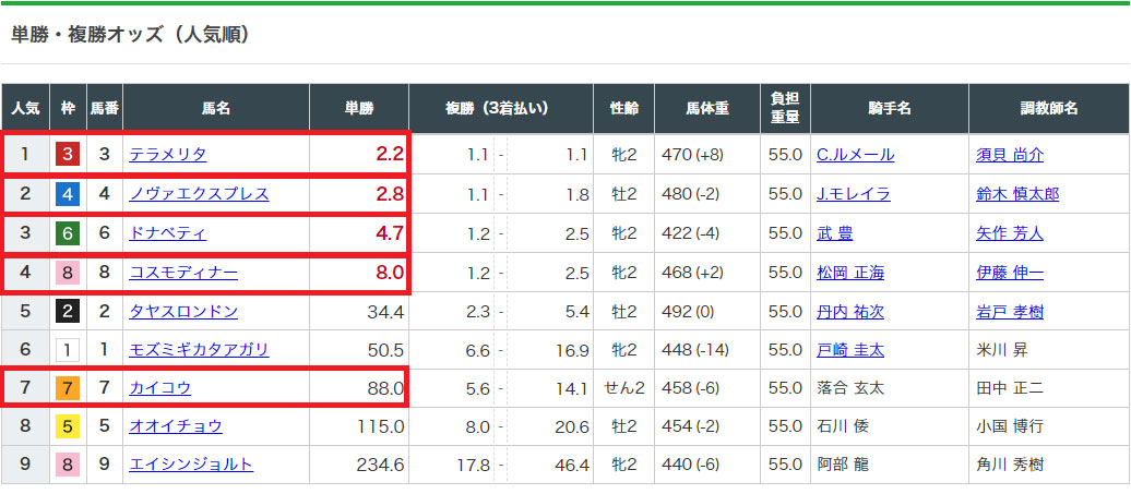 2番人気馬が絡んだものの4番人気⑧コスモデイナー、7番人気⑦カイコウが馬券内に入り3連複「98.2倍」と美味しい配当に。