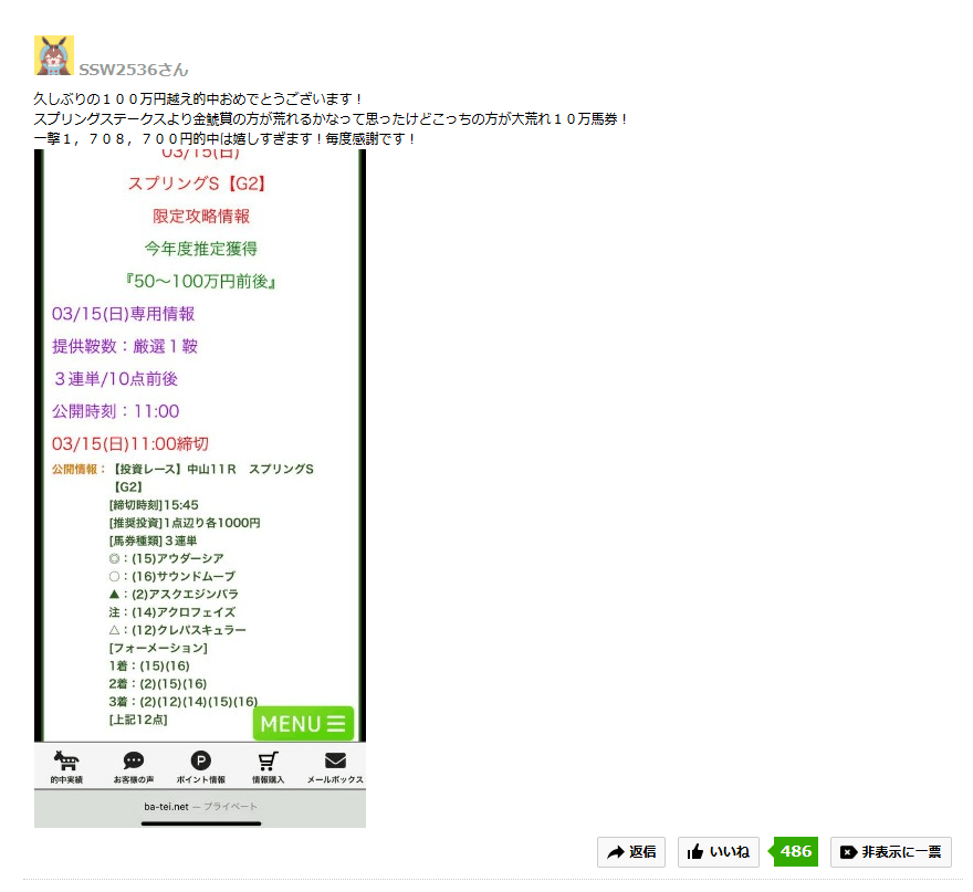15日(日)中山メイン「G2スプリングS」予想で3連単点数を押さえて買い目点数12点で10万馬券となる「1708.7倍」を見事的中!