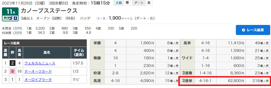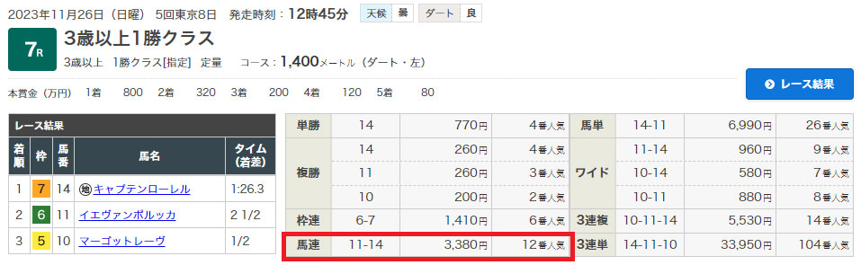 馬連34番人気で113.8倍的中で払い戻し金額『11万3800円』GET!