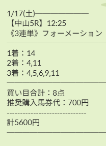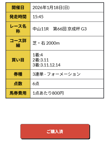 1月の重賞は毎年、金杯からずっと荒れますね、競馬場ではゴール後に悲鳴でしょうが私は歓喜でした。 軸は前評判人気馬だったから個人の予想で買えても、2着、3着と11人気、9人気は絶対に拾えていなかったです。 気持ち的にはもっとオッズ上ってほしかったけど、50万9500円払い戻しは1月から上々のスタートです。 競馬予想サイト使うからにはこれくらいを毎回貰いたいところですね。