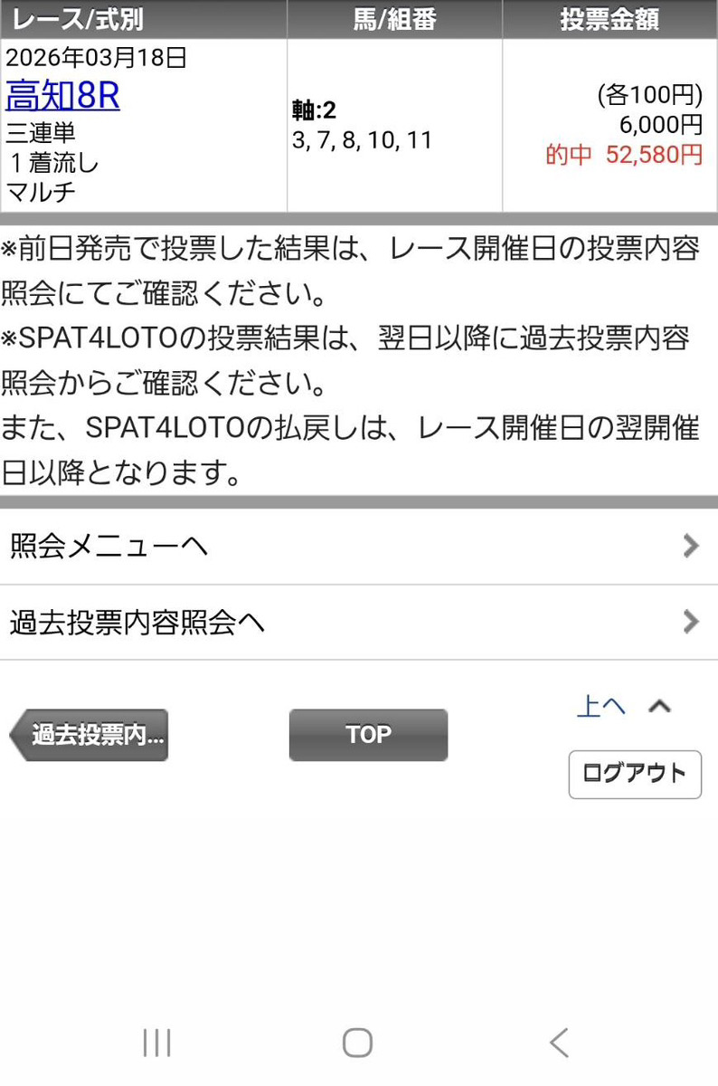重賞の3連単無料予想ではなかったけどしっかり万馬券的中で、推奨金額通り馬券購入して4万530円払い戻し! たまらない的中まじでありがとうございました!