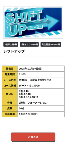 ここんとこ調子良さそうな競馬予想だったから使って良かったです、前回も10万越えだったような?!
