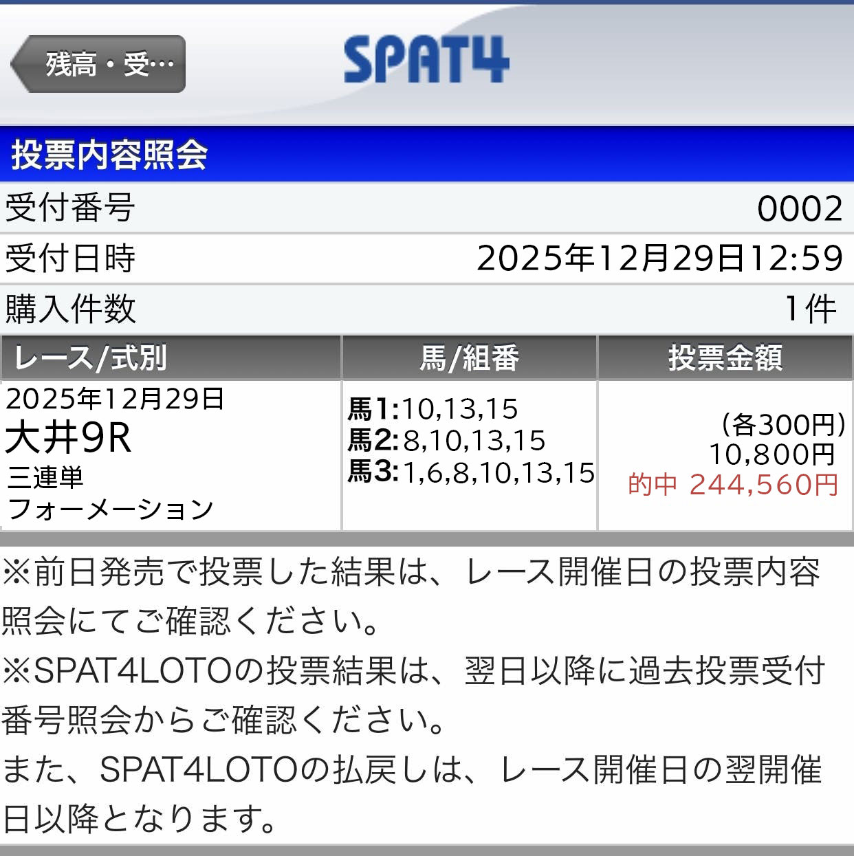 有馬記念も攻略出来て、東京大賞典もこの波で攻略したいとこだな。 地方の事は全てこの予想に全乗りです、年末年始予想出すみたいだしこの三箇日も楽しみにしていますよ。 まずは年末ガッツリ稼がせてください、